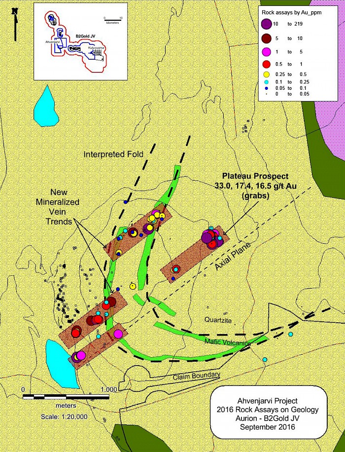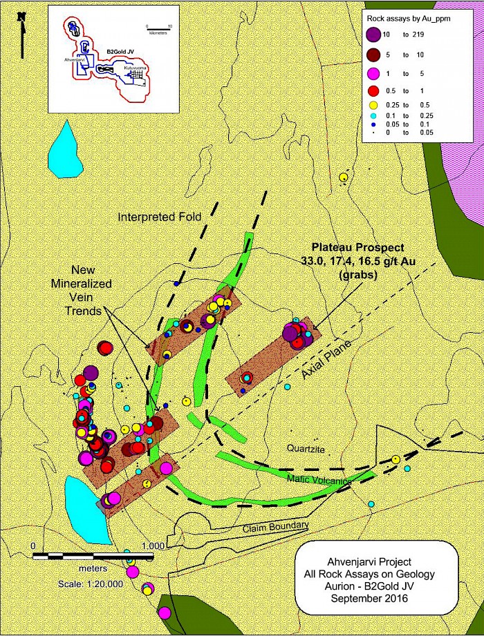 Aurion Resources Ltd. (“Aurion”) (TSX VENTURE: “AU”) and its partner B2Gold Corp. (TSX: BTO, NYSE MKT: BTG, NSX: B2G); (“B2Gold”) are pleased to report that prospecting and reconnaissance mapping has resulted in the discovery of new high grade gold mineralization at the Ahvenjarvi project in Northern Finland.