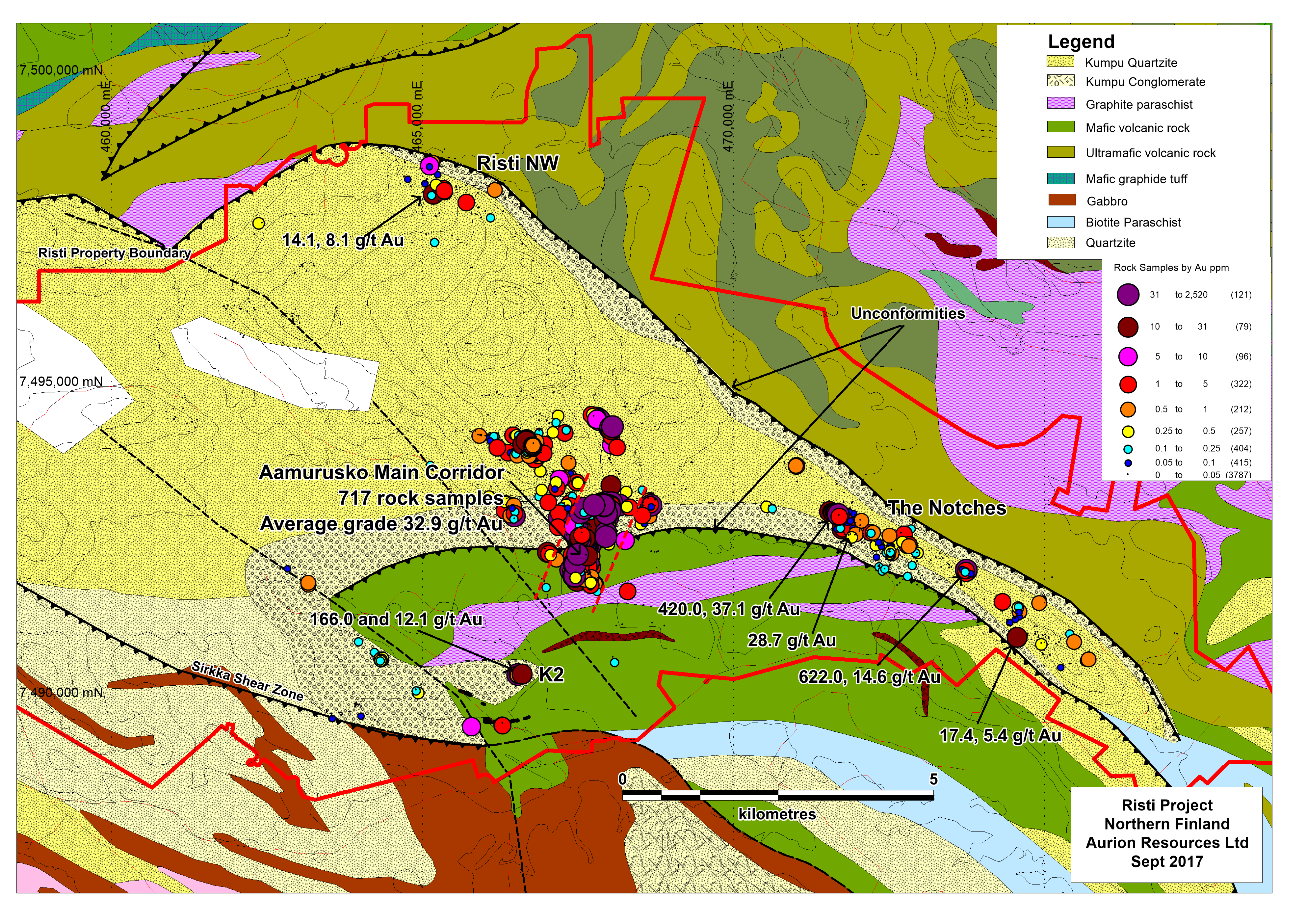 The Risti Property comprises an area of approximately 15,000 ha and covers approximately 30 km of interpreted regional unconformities defined by the contact between the Kumpu Group conglomerates and the older mafic and ultramafic volcanics, of the Sodankyla and Savukoski Groups adjacent to the Sirkka Shear Zone, a major regional fault/deformation zone in the CLGB. The setting of the Aamurusko gold mineralization, is analogous to the setting of many of the world class gold deposits in the Timmins camp of the Abitibi province of Northern Ontario. More than 72.5 million ounces of gold in several deposits in the Timmins camp are hosted by polymictic conglomerates and mafic volcanics proximal to major unconformities adjacent to the regional Porcupine-Destor fault/deformation zone.