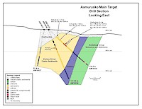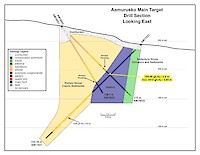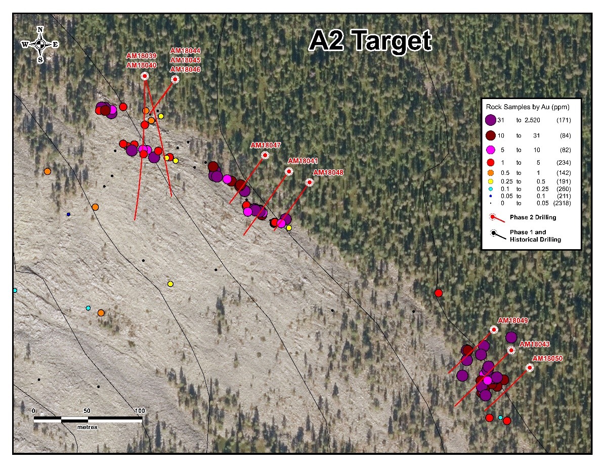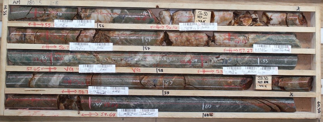 AM18035 located 230 m east of AM01842 encountered multiple extensional vein zones including a 5.20 m wide zone assaying 12.45 g/t Au from 53.50 to 58.70 m downhole including 66.70 g/t Au over 0.50 m, and 54.3 g/t over 0.49 m. Further up hole a 1.55 m wide quartz vein zone from 36.65 to 38.20 m assayed 8.74 g/t Au and from 26.30 to 28.04 m a 1.74 m wide quartz vein zone assayed 9.62 g/t Au.