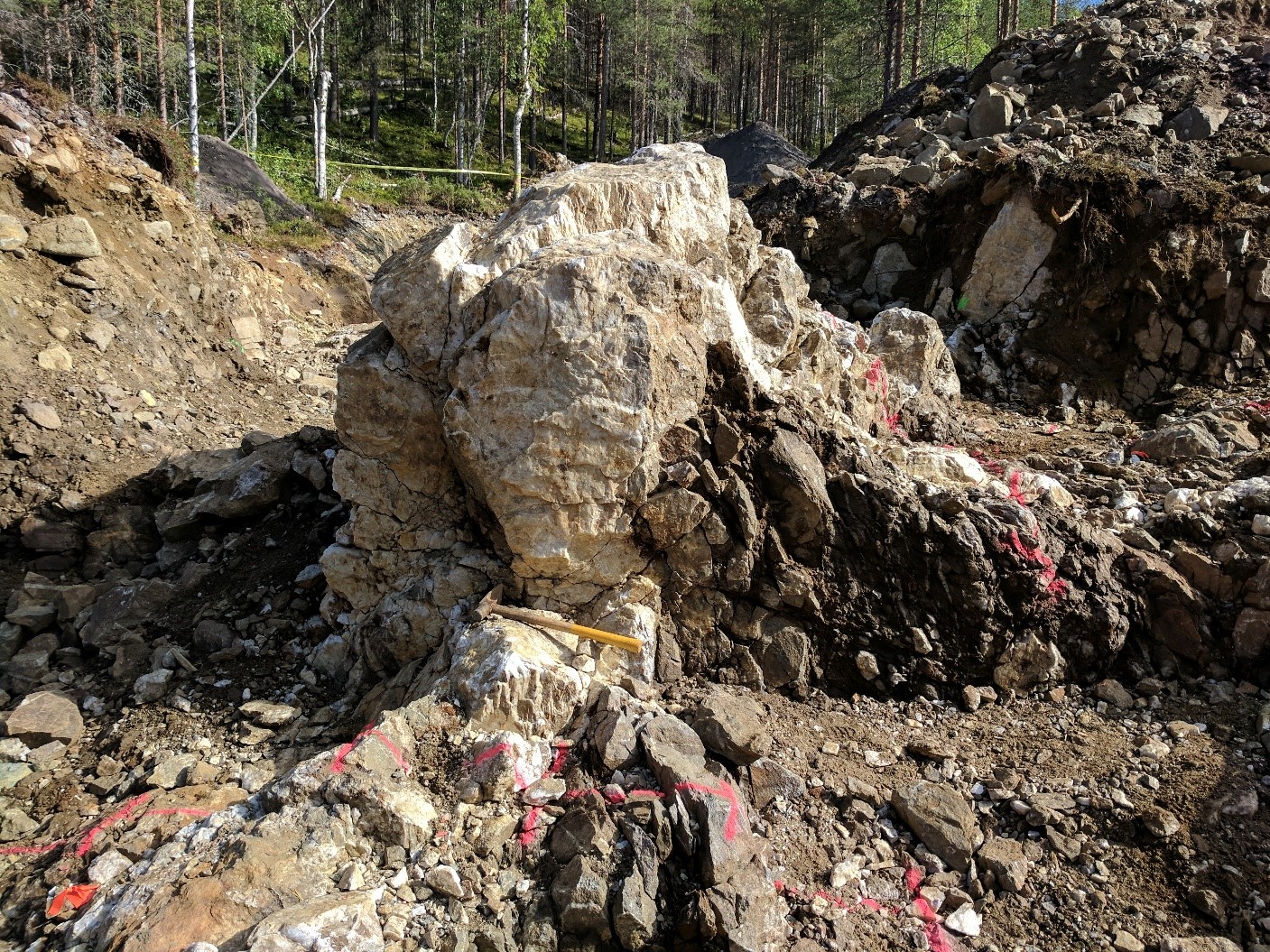 Four drillholes on two fences, approximately 30 m apart, were completed at a new discovery approximately 1.9 km west of the eastern extent of the main Aamurusko boulder field. Mechanical trenching of a cluster of auriferous boulders discovered in 2017 exposed multiple quartz veins up to 1.5 m wide accompanied by strong iron carbonate alteration. This east-west trending, steeply north dipping quartz vein zone was traced in trenching for approximately 40 m before going under cover. Assays are pending from the channel sampling and drilling. The mineralization is located at the sheared contact between polymictic conglomerate, quartzite and mafic volcanics.