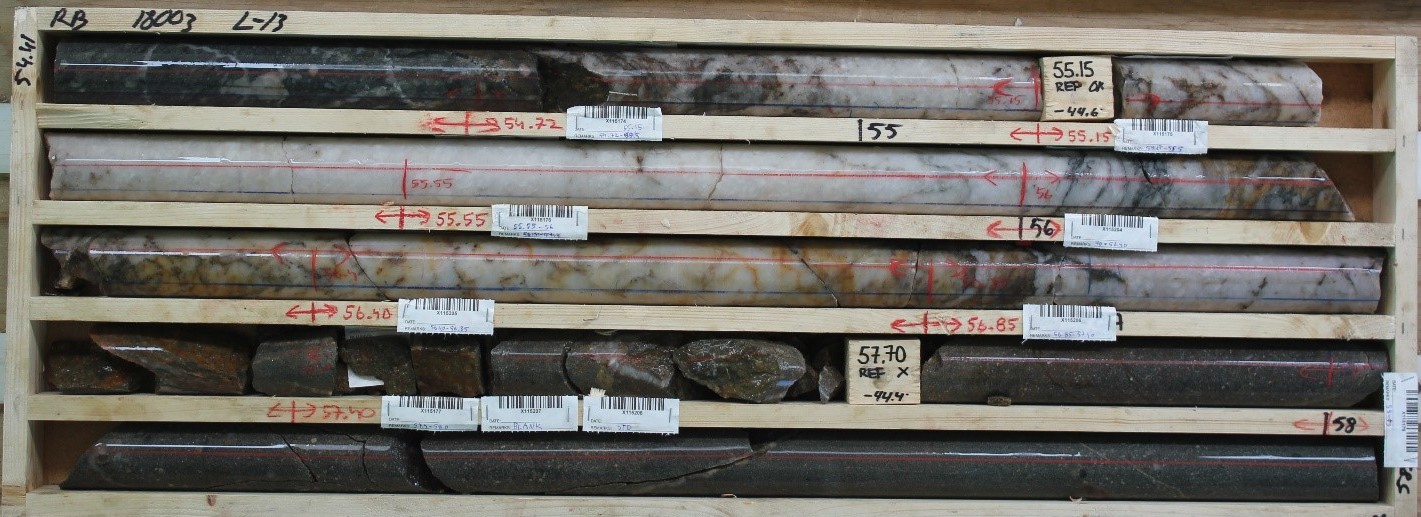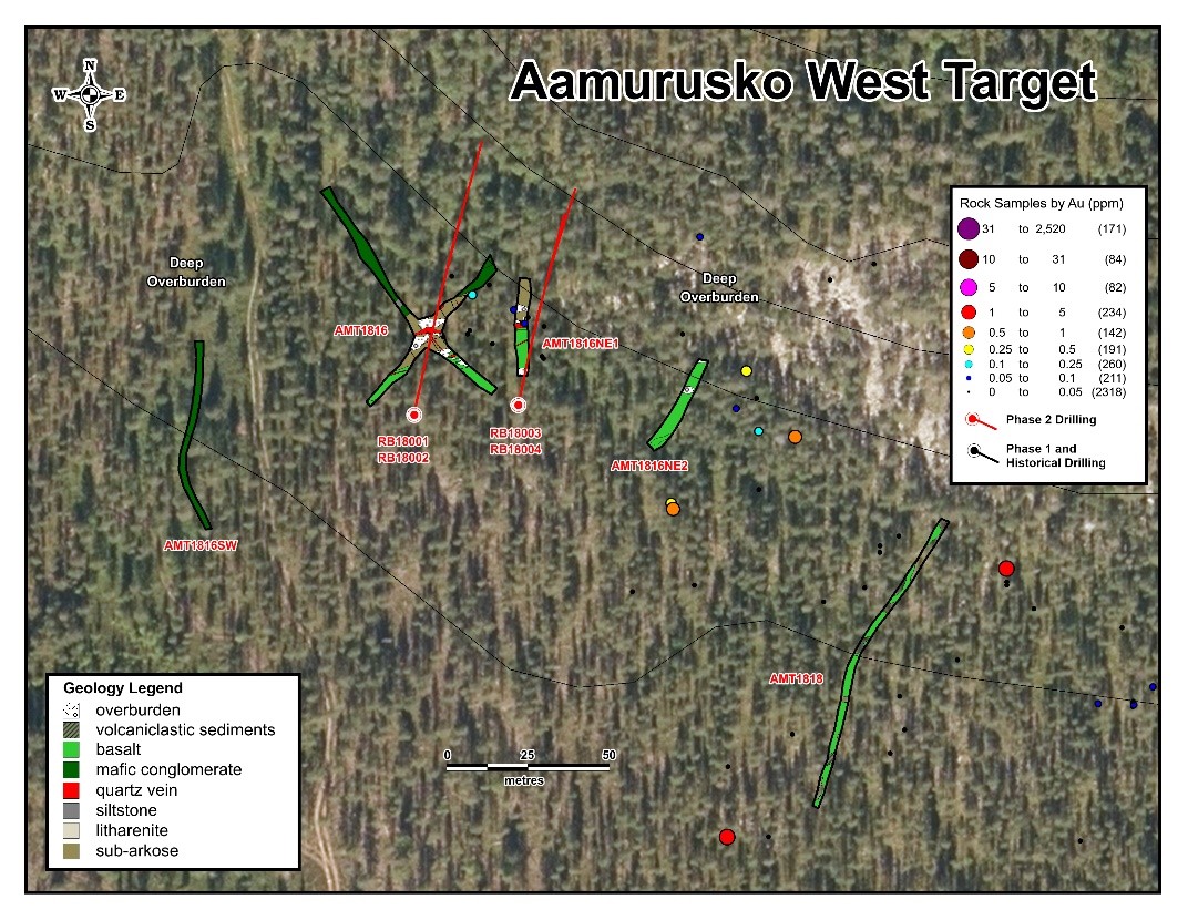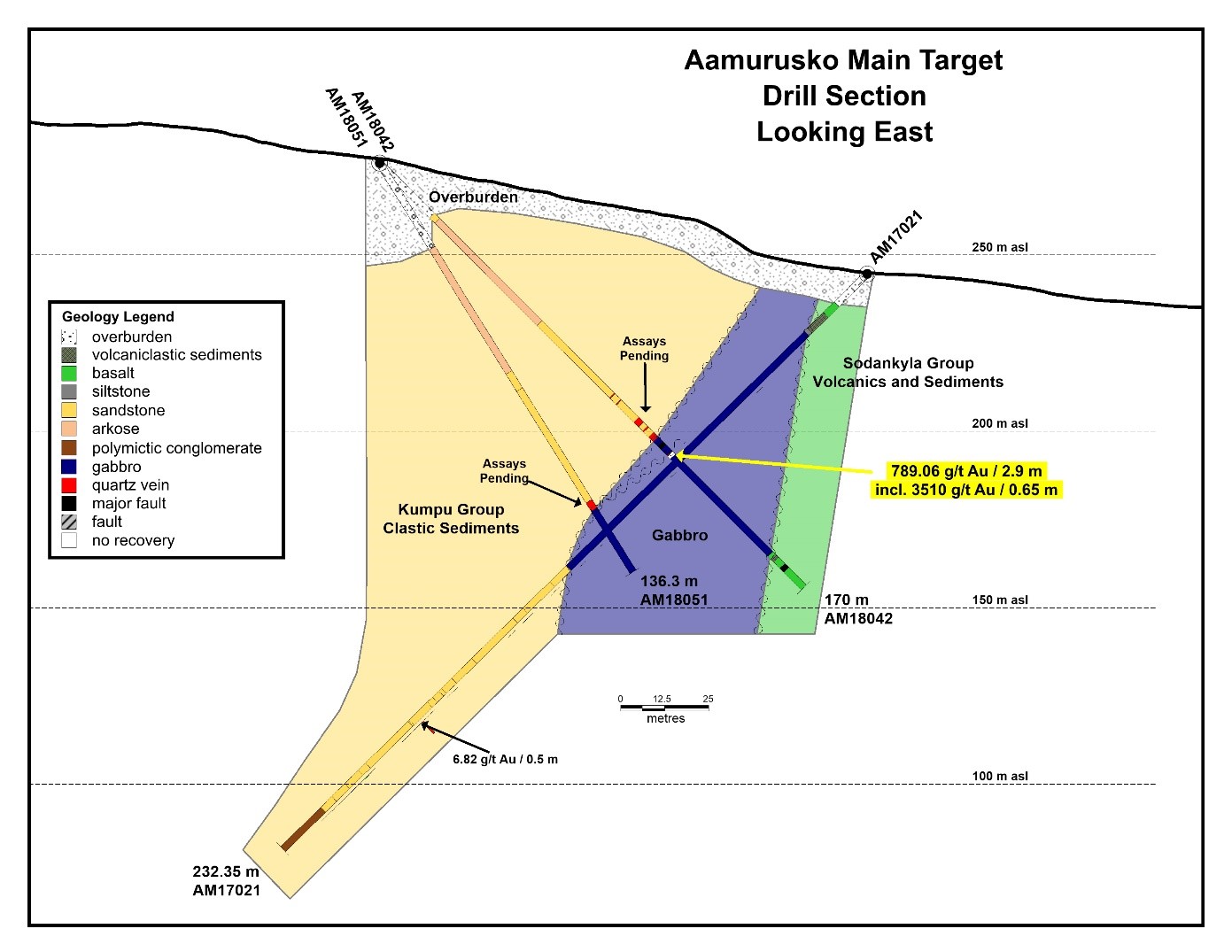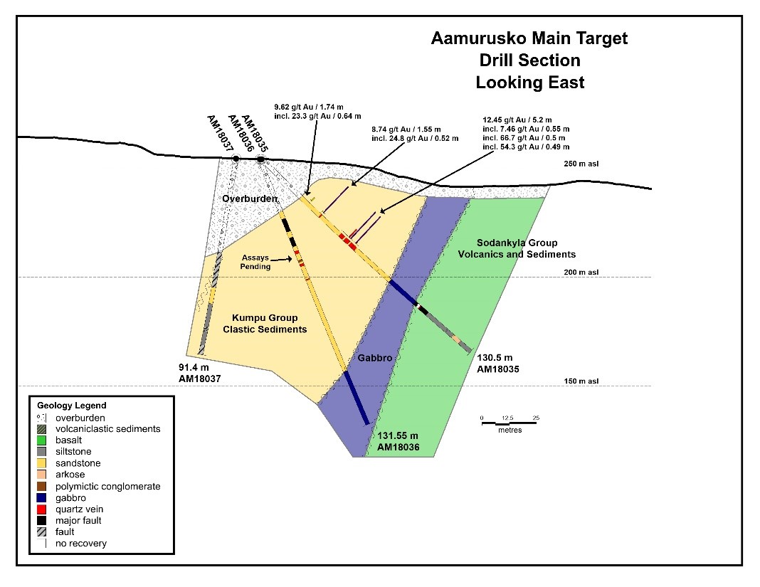Eight drillholes on five fences were completed over a distance of 185 m approximately 800 m west-northwest of the eastern extent of the main Aamurusko boulder field. Assays have been received from all holes. The best assay results came from drillhole AM18026 which returned of 25.00 g/t Au over 0.6 m and 5.03 g/t Au over 1.00 m. All drillholes intersected quartz veining with anomalous gold values. Mineralization is hosted by quartz veins in clastic sediments and gabbro.