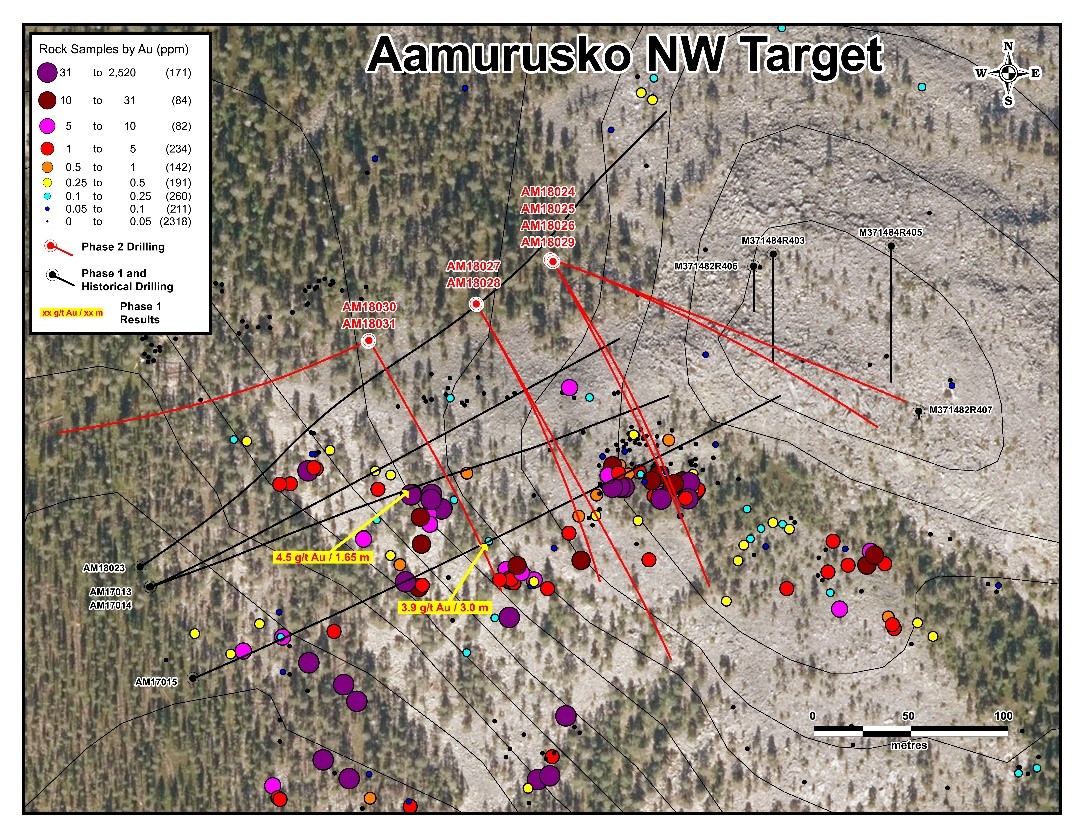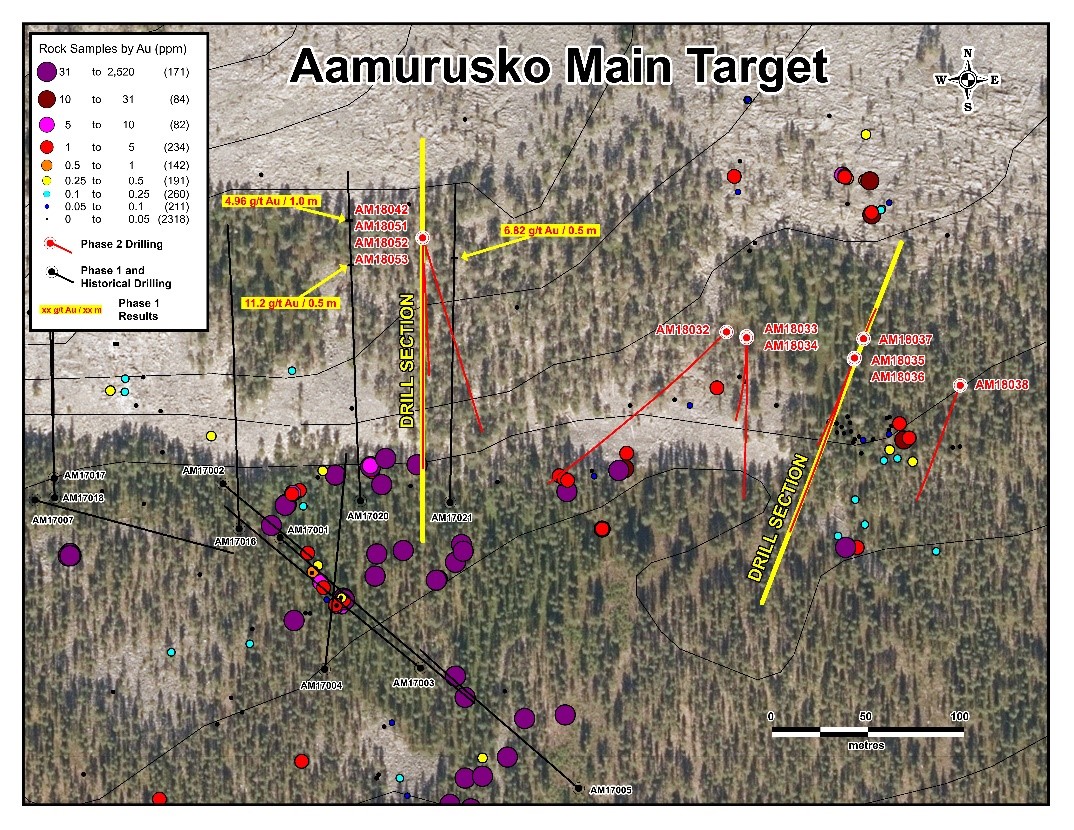 Eleven drillholes were completed over a strike of 450 m approximately 1.2 to 1.4 k m north-northwest of Aamurusko. Three target areas were tested. Partial assays have been received for 4 of 12 drillholes. The best assay result to date was 22.00 g/t Au over 0.45 m from 38.45 to 38.90 m downhole from AM18041. Mineralization is hosted by clastic sediments.