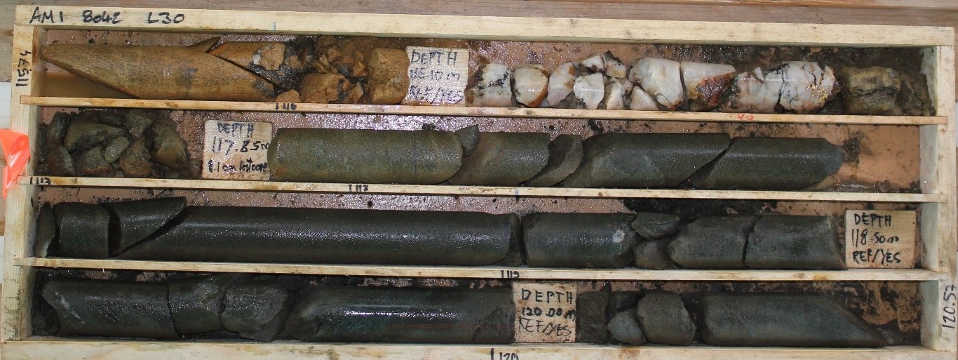 Partial assays have been received from 5 of 11 drillholes to date. The best result so far has been in hole AM18042 where a 2.90 m wide fault fill vein with coarse visible gold was intersected. It assayed 789.06 g/t Au over 2.90 m from 116.10 to 119.00 m including 0.65 m assaying 3,510.00 g/t Au. Unfortunately, 1.1 m of core within this interval was lost in the fault/shear zone. This interval was assigned a value of zero.