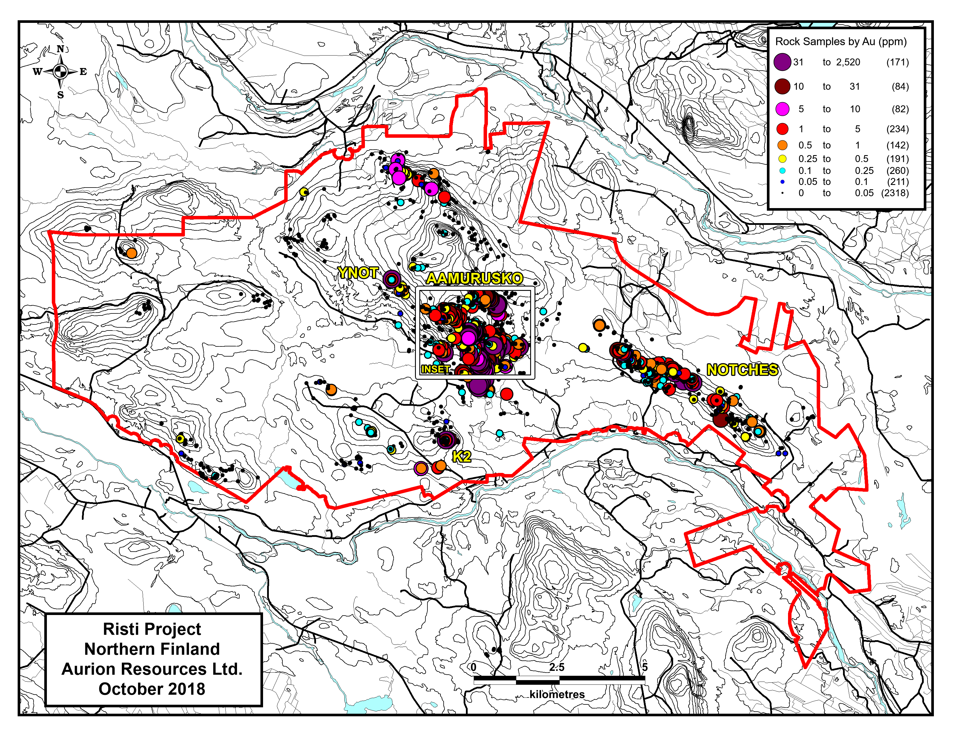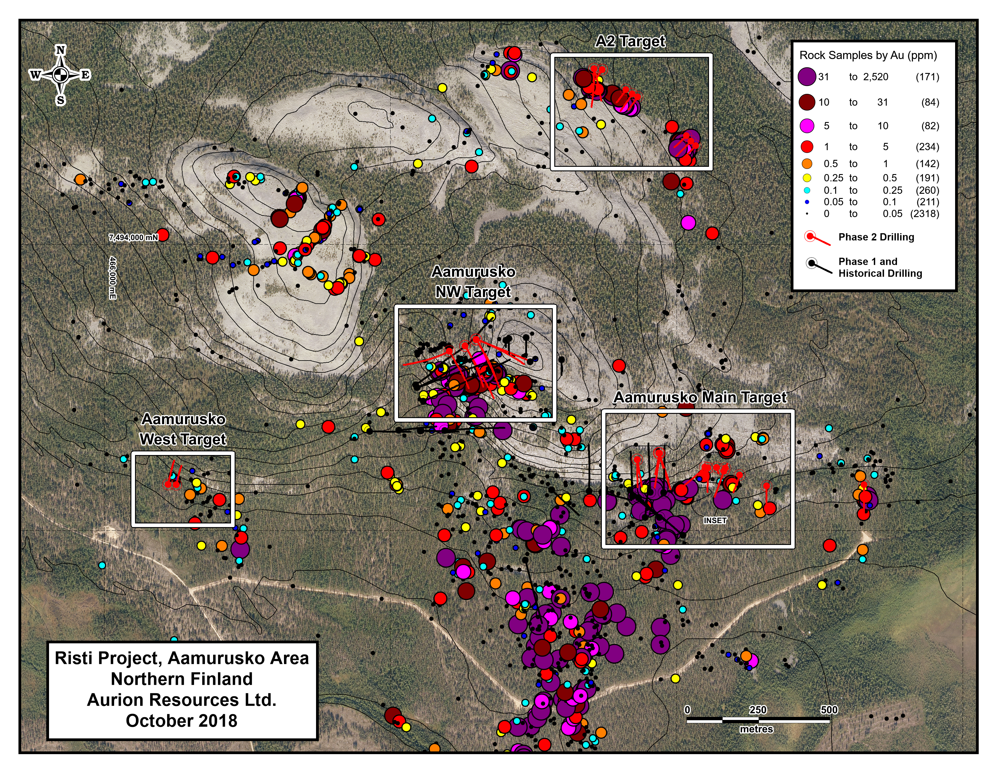 “Despite slow drilling production and slow assay laboratory turn around of results, our second field season and second drilling campaign at Risti and Aamurusko continue to advance the project immensely. The discovery of high grade gold mineralization in both shear veins and extensional veins immediately north of the main Aamurusko boulder field supports proof of concept regarding a concealed structure(s) dipping to the north. It also indicates multiple gold enriching events. Additionally, the discovery of auriferous gold mineralization in trenching and drill core in multiple targets over a distance of more than 8 km suggests the mineralizing system at Aamurusko and Risti in general may have considerable scale. It is important for readers to keep this in context, commented Mike Basha, President and CEO. “There are many targets over >15 km of strike across Risti that will require a lot of drill testing. Aurion is funded to advance the Aamurusko discovery and the Risti Project into the foreseeable future. This is a very exciting time for Aurion and its shareholders”.