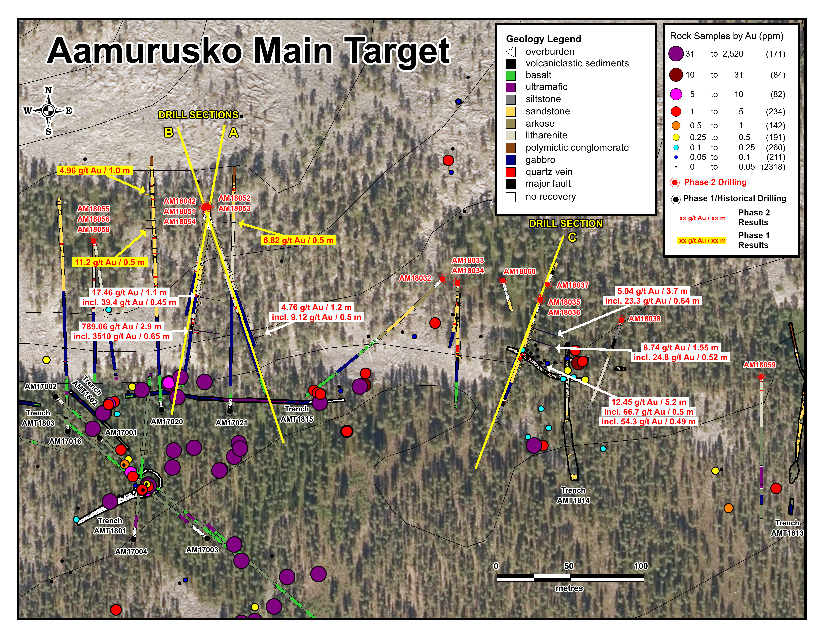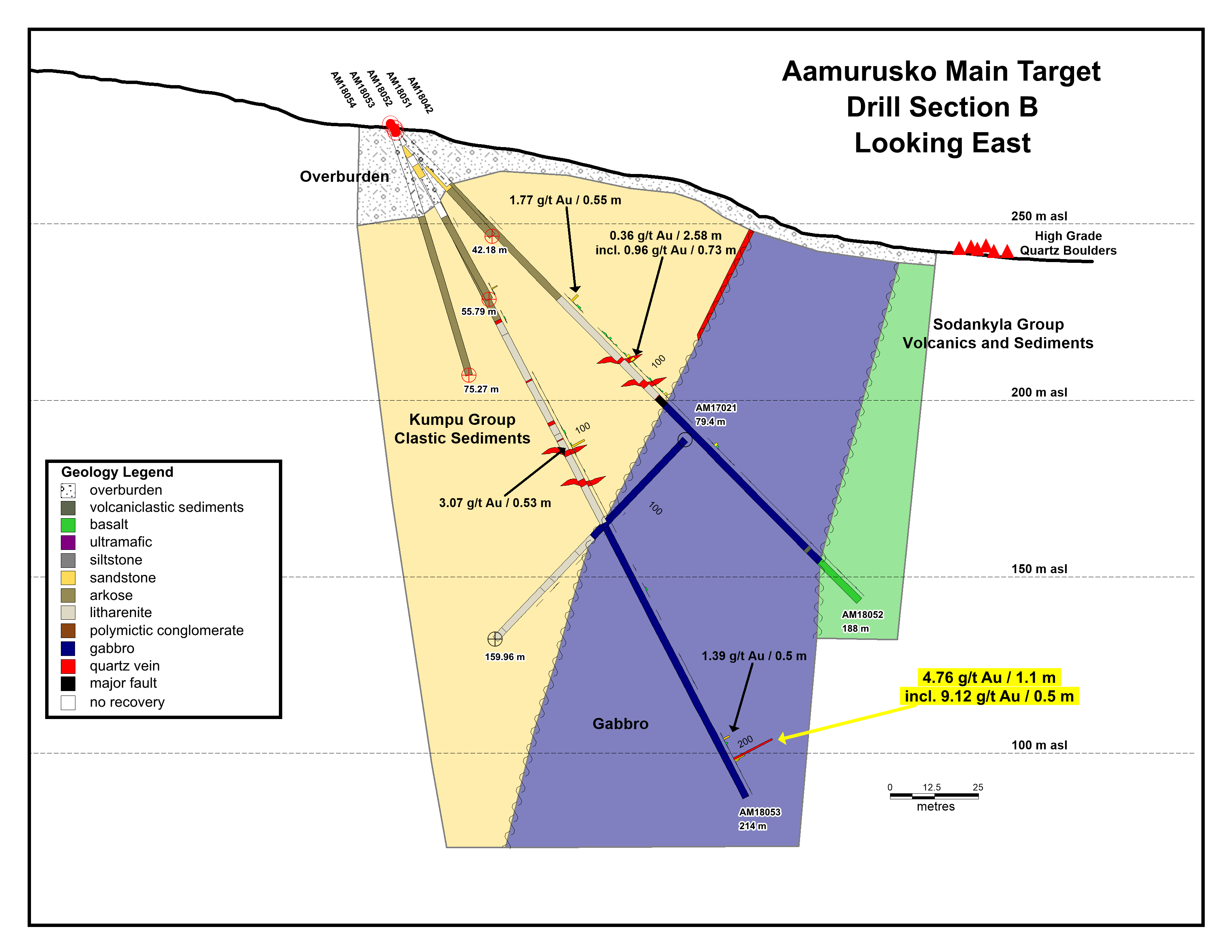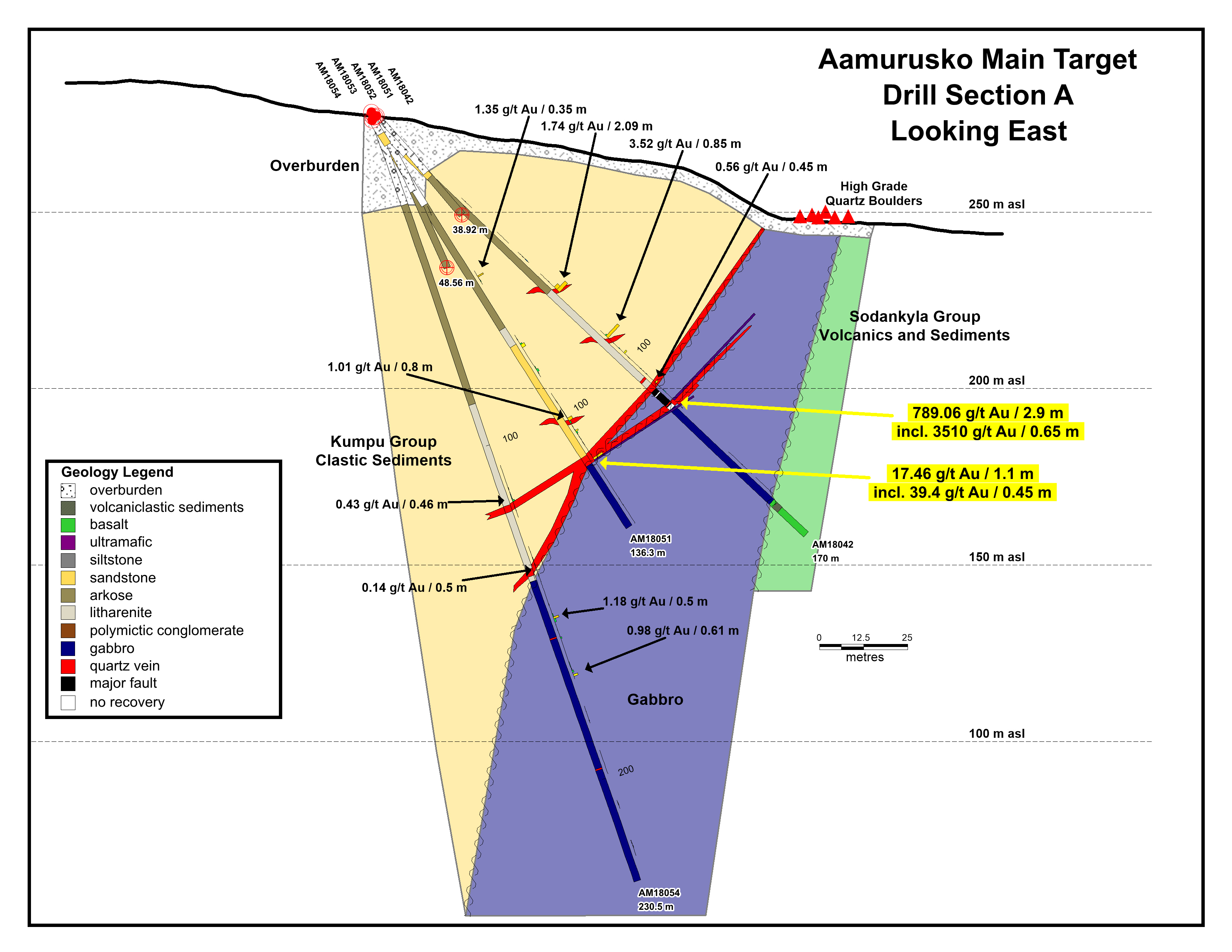 Drilling continues to intersect quartz veins occurring proximal to the sheared contact between clastic sediments of the Kumpu Group and a gabbro sill on the contact between the Kumpu Group and mafic and ultramafic volcanics of the Sodankyla Group, immediately north of the Aamurusko boulder field. However, current structural geological interpretation indicates a complex mineralizing system, which is often typical of orogenic gold systems. With only 10 drillholes into the main target and assays received for only 5, the structural controls on mineralization are still not fully understood.