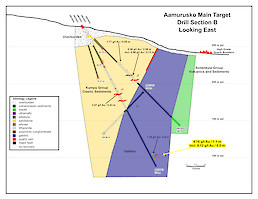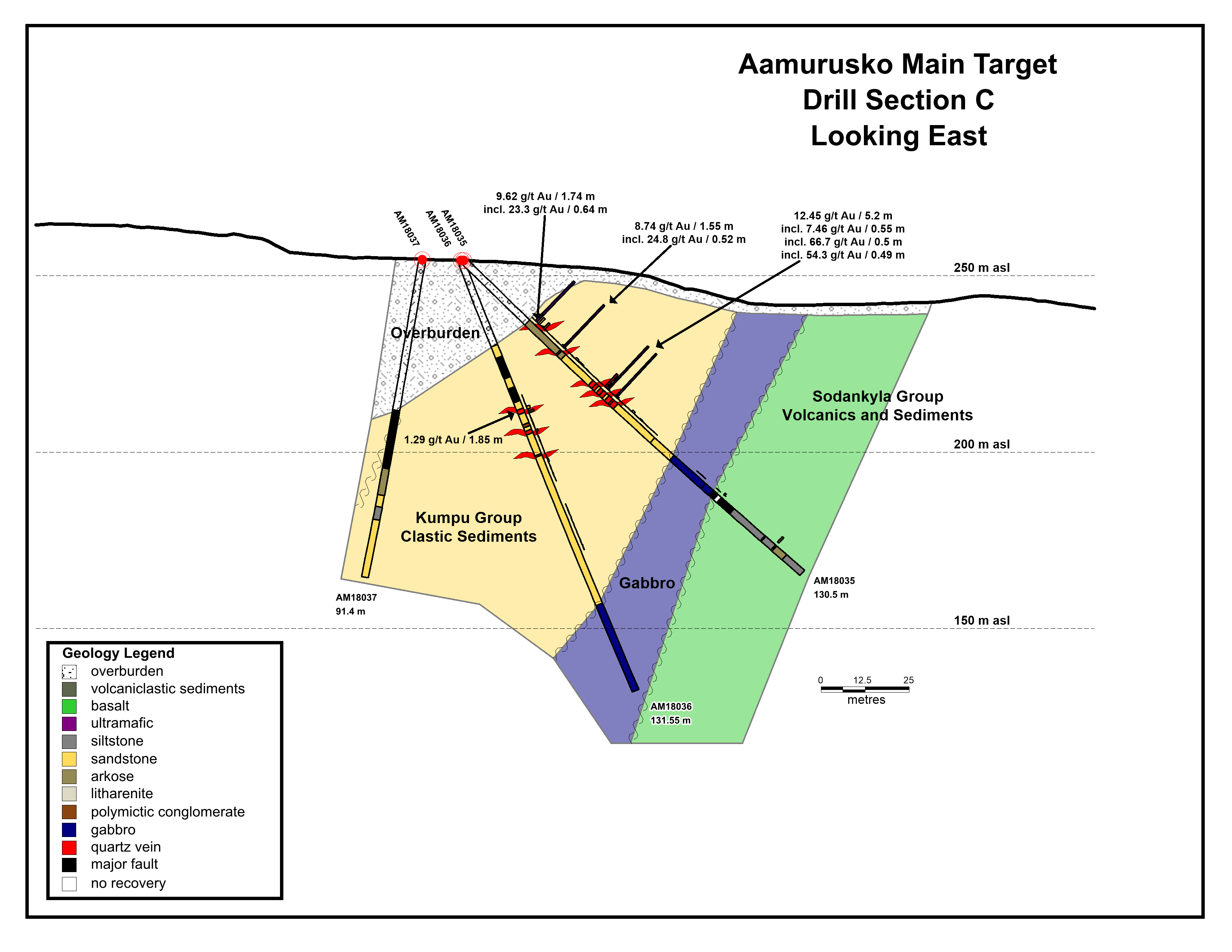 Drillhole AM18053 intersected a 3.5 m wide breccia vein zone from 102.00 to 105.50 m in clastic sediments with anomalous gold values throughout including 3.07 g/t Au over 0.53 m. No significant quartz veining was encountered at the gabbro contact. A new zone of gold mineralization comprising quartz carbonate veins and stringers with several percent arsenopyrite, galena and sphalerite was intersected at 196.1 to 203.7 m depth in the gabbro. The best assay result was 4.76 g/t Au over 1.2 m including 9.12 g/t Au over 0.5 m.