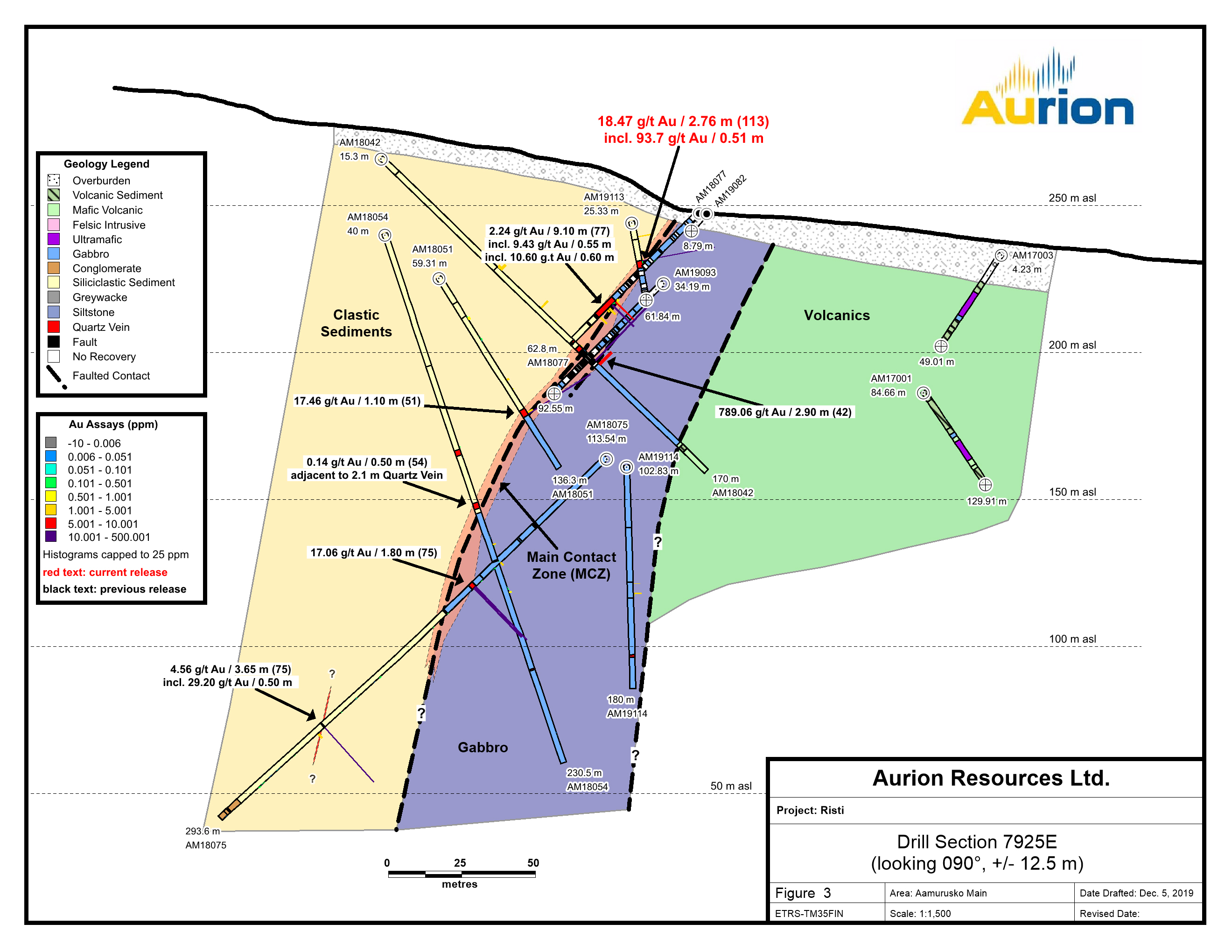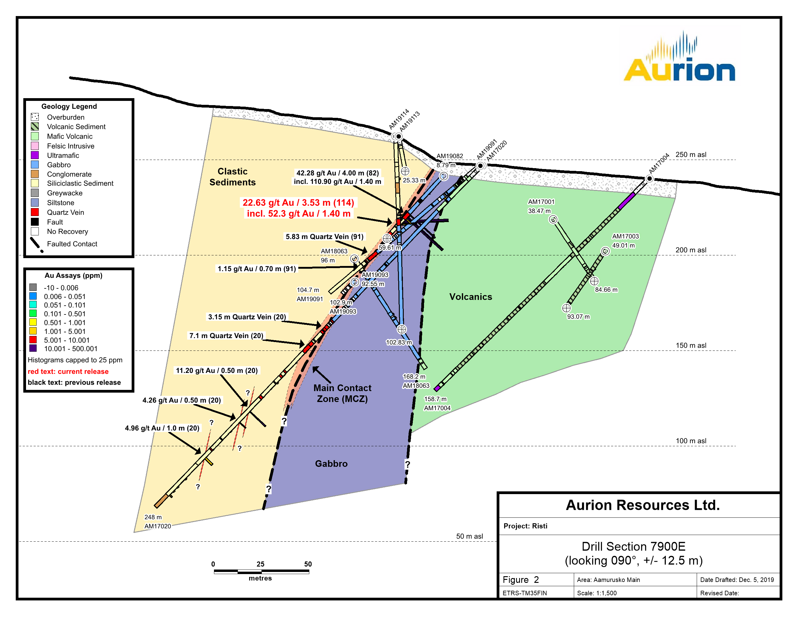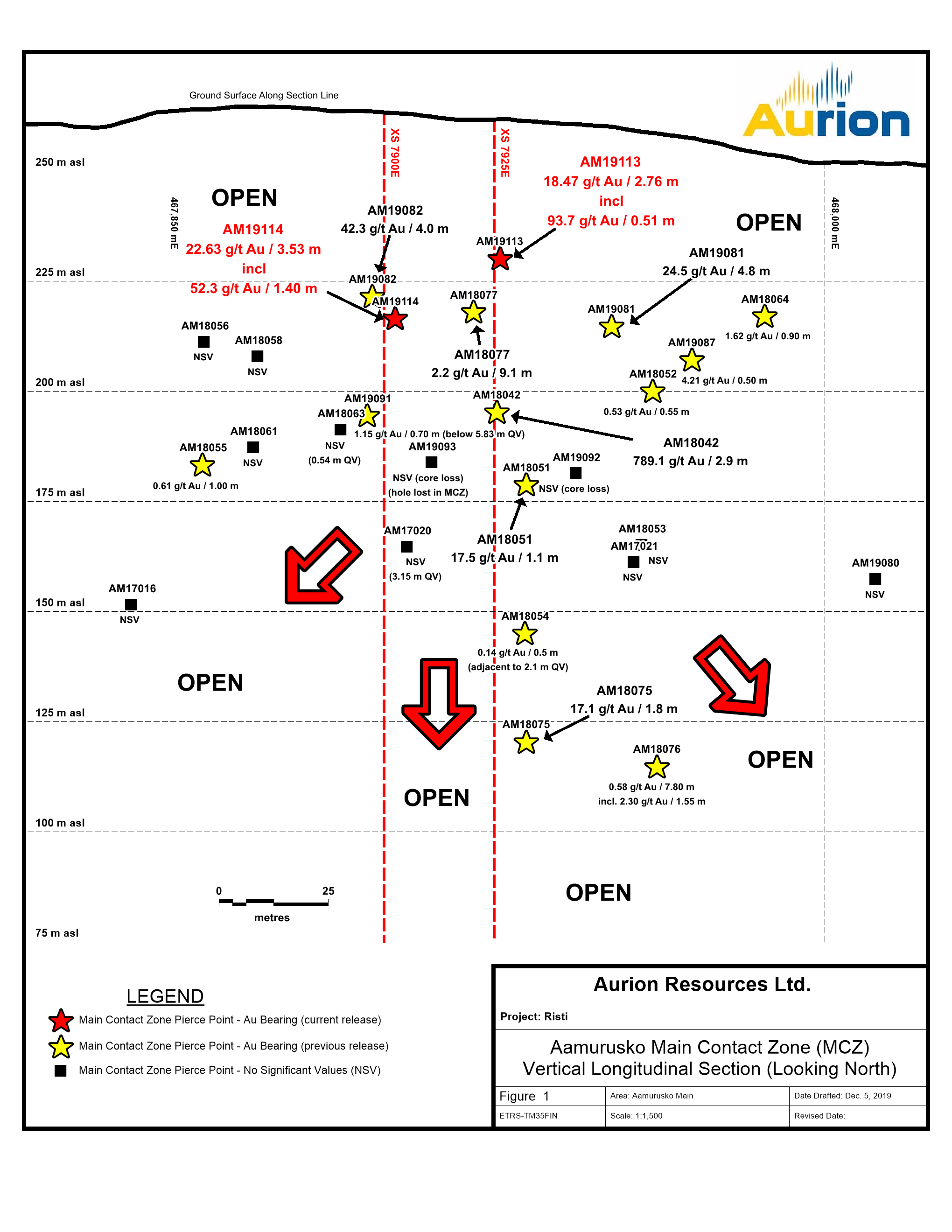 Aurion Resources Ltd. (TSX VENTURE:AU) (“Aurion” or the “Company”) is pleased to announce that it has received assays from 2 holes drilled at the Aamurusko Main prospect on its wholly owned Risti Project in northern Finland. These holes are follow-up to drill results reported on September 19th, 2018 and February 15th, 2019, which included 789 grams per tonne (“g/t”) Au over 2.90 metres (“m”) in drill hole AM18042, 42.28 g/t Au over 4.0 m in drill hole AM19082 and 24.50 g/t Au over 4.75 m in drill hole AM19081.