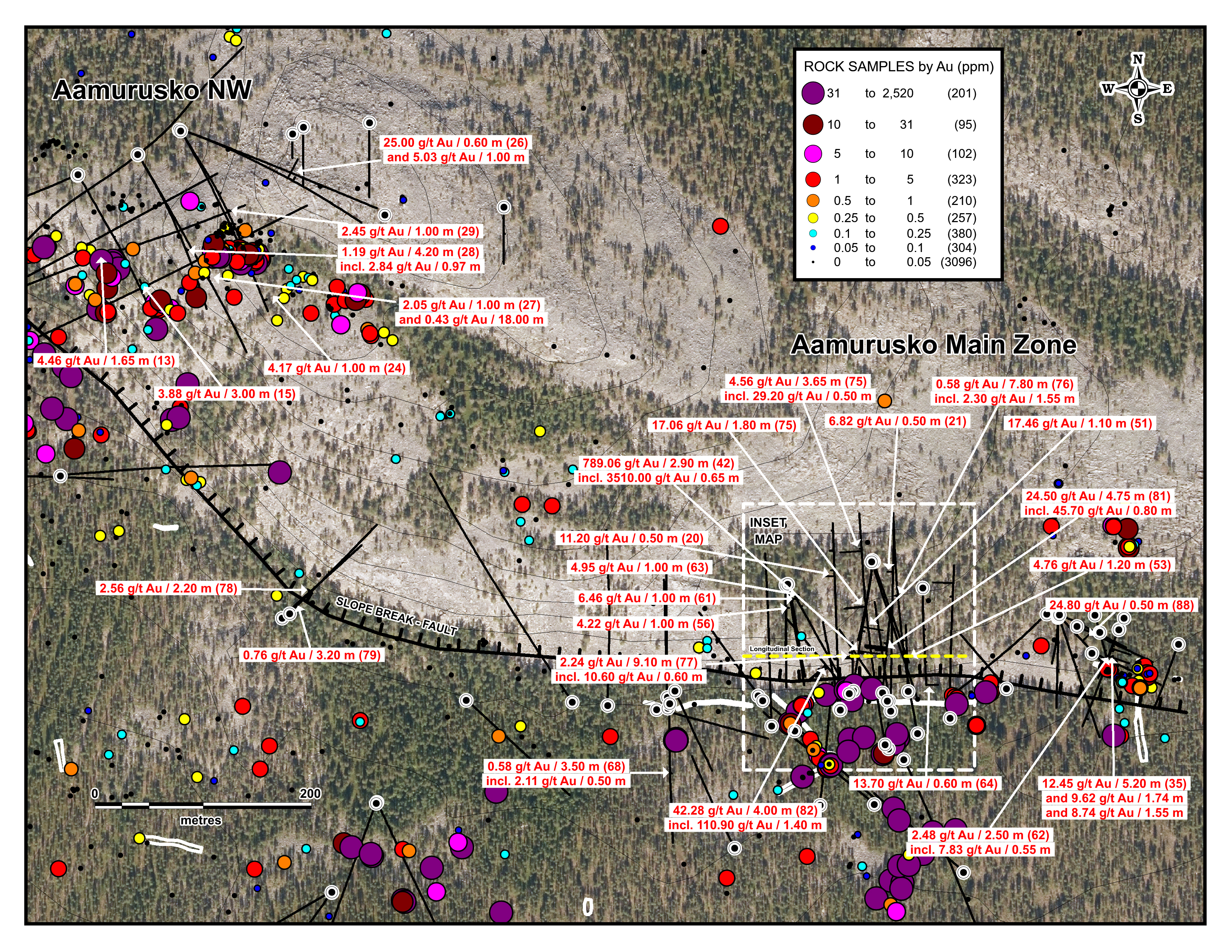 -grade boulders at Aamurusko. Gold mineralization was also intersected in 500 and 800 m step out drillholes to the west-northwest providing further evidence that additional near surface gold mineralization may exist in the same geological/structural setting west of the current main focus of drilling.