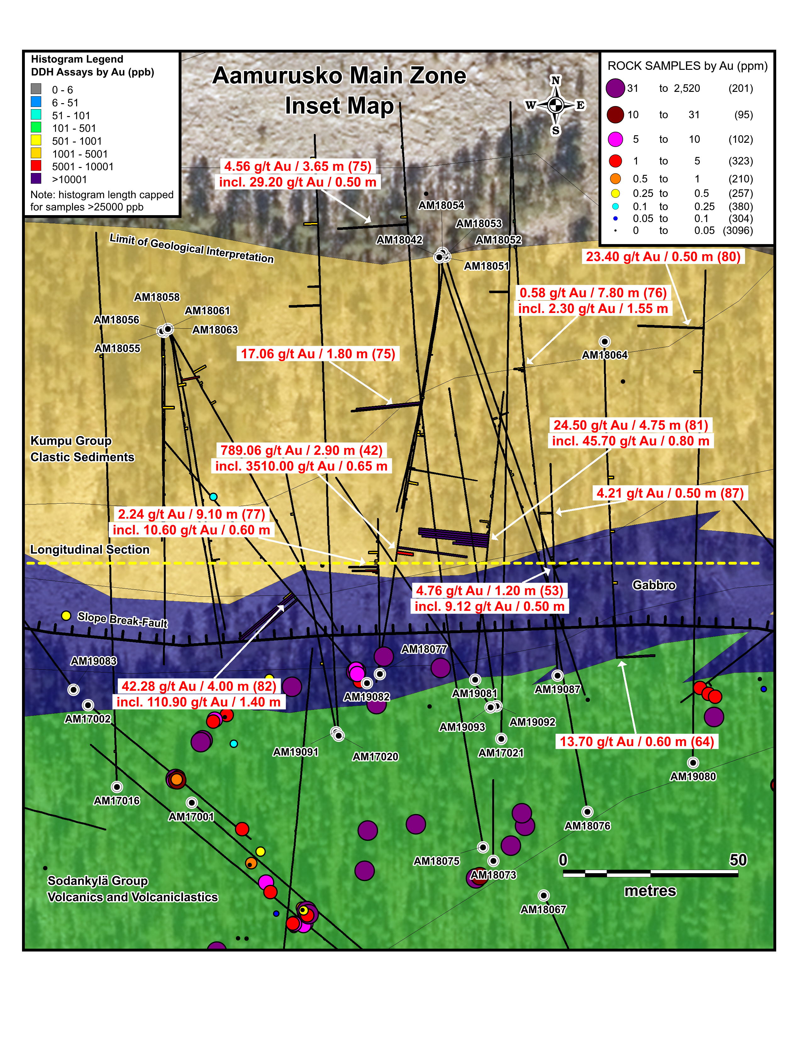 - 24.80 g/t Au over 0.50 m intersected in drillhole AM19088 at Aamurusko