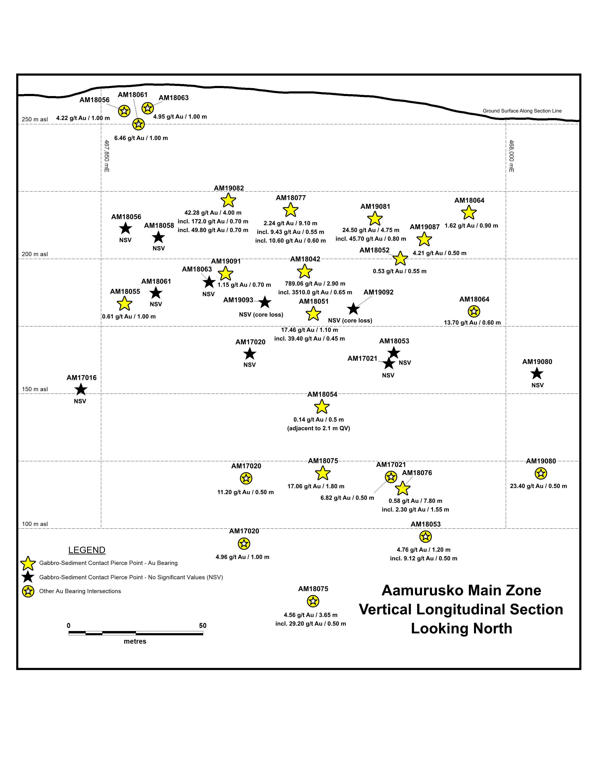 Drillhole AM19087 intersected quartz veins assaying 4.21 g/t Au over 0.50 m from 60.15 to 60.65 m. This drillhole was drilled approximately 20 m east of drillhole AM19081 which intersected quartz veins assaying 24.50 g/t Au over 4.75 m from 48.80 to 53.55 m. Drillhole AM18064 drilled a further 25 m east of AM19087 intersected 1.62 g/t Au over 0.90 m from 78.10 to 79.00 m. These intercepts occur proximal to the sheared gabbro-sediment contact and may extend the strike of the mineralized zone/shoot to 100 m.