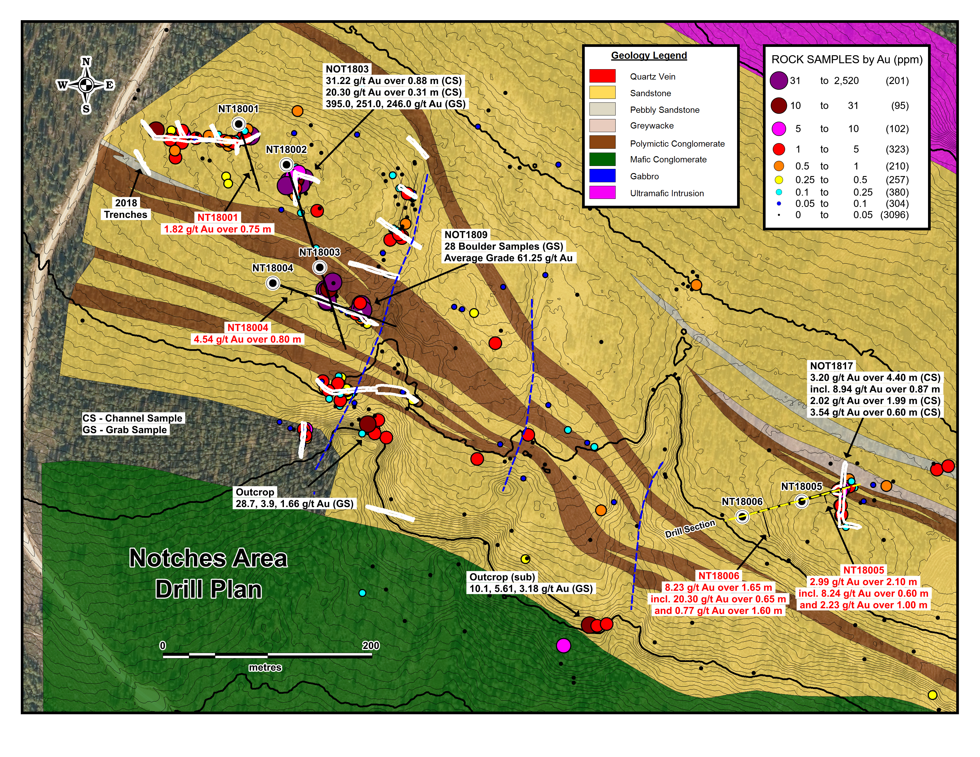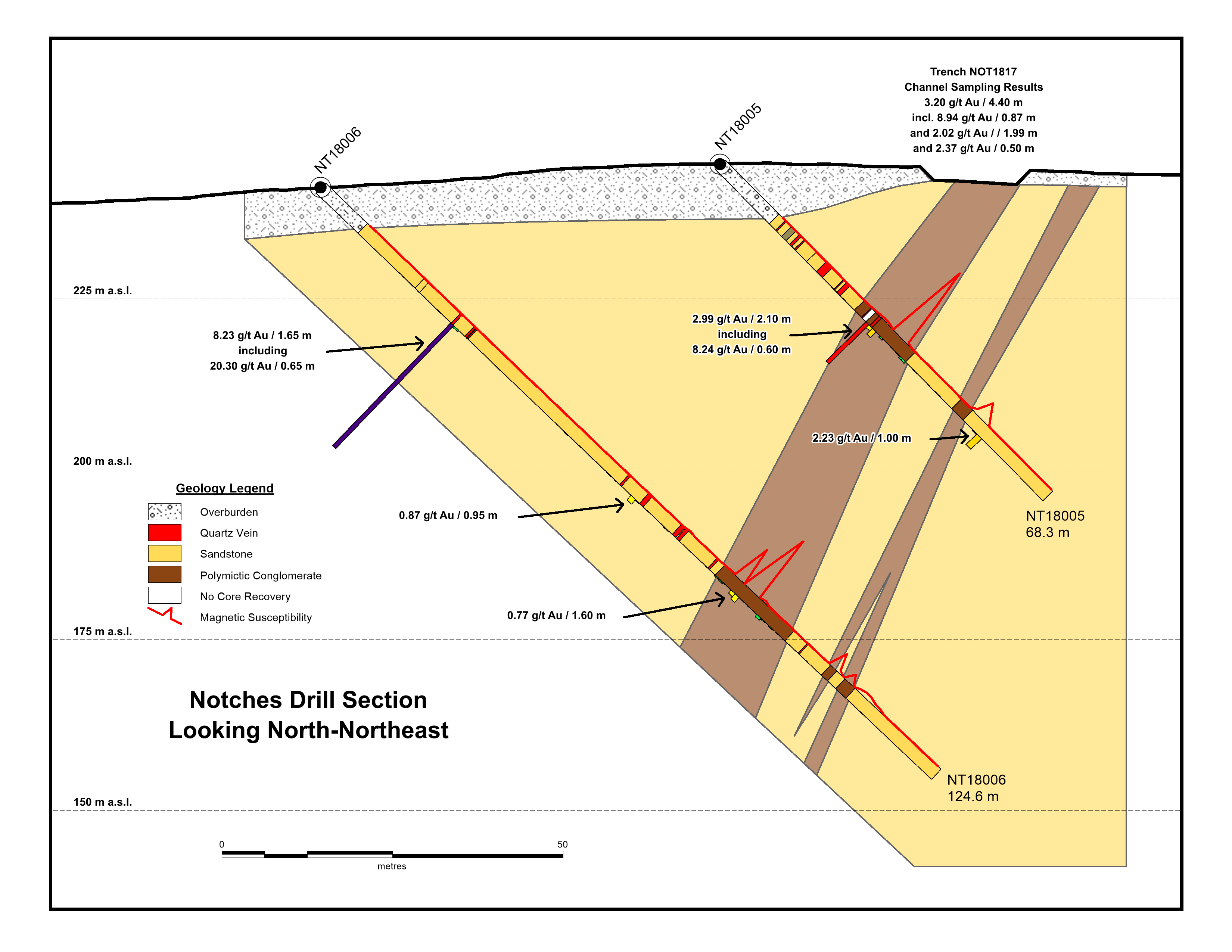 - 20.30 g/t Au over 0.65 m intersected in drillhole NT18006 at Notches