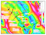 A ground magnetic survey at 25 m line spacings and totaling 600 km was completed over the Launi East property in 2019. This high-resolution survey will be useful in targeting mineralization as the alteration in the known auriferous deformation zones is magnetite destructive and creates magnetic lows.