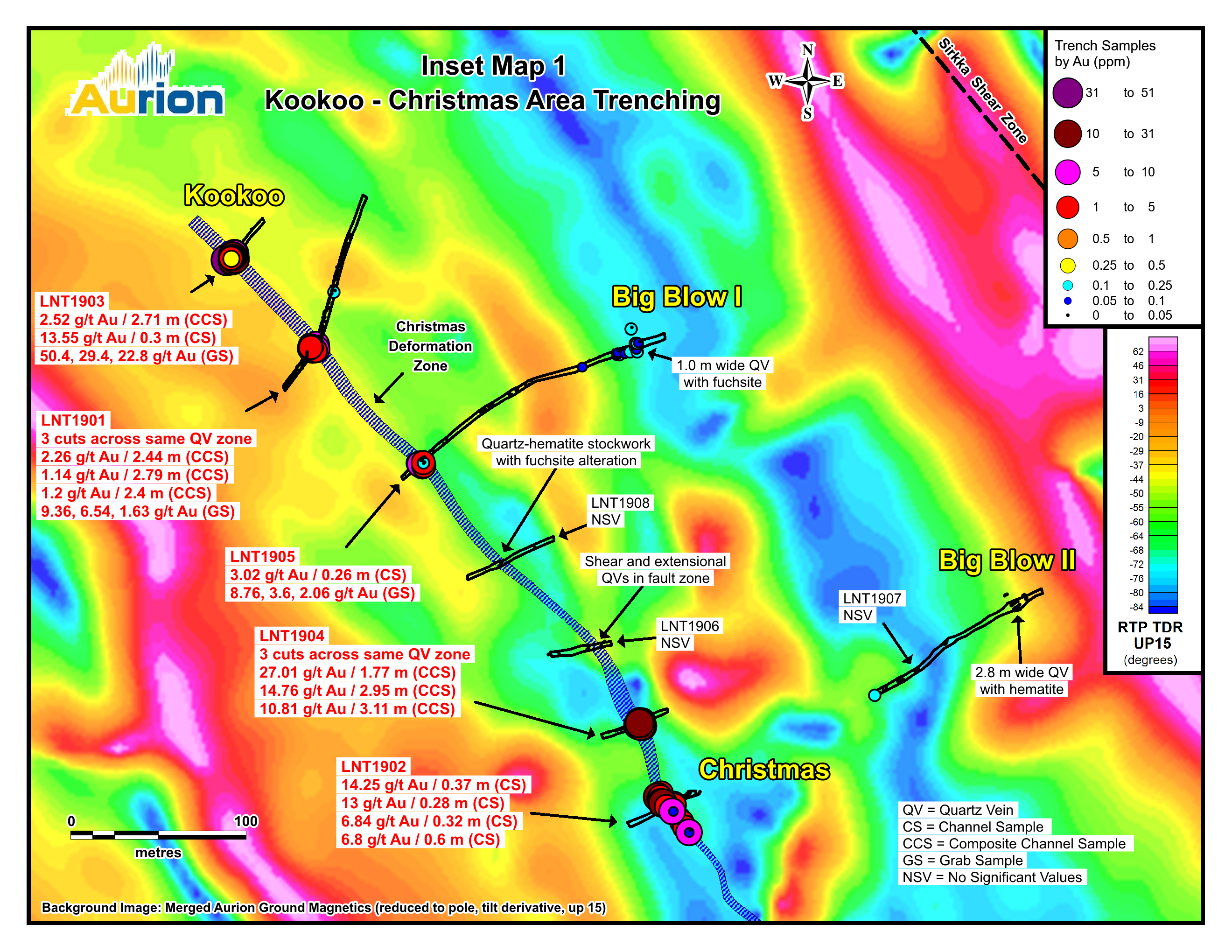 The Launi drill program will initially focus on a 420 m long section of the Christmas Deformation Zone between trenches LNT1902 and LNT1903.