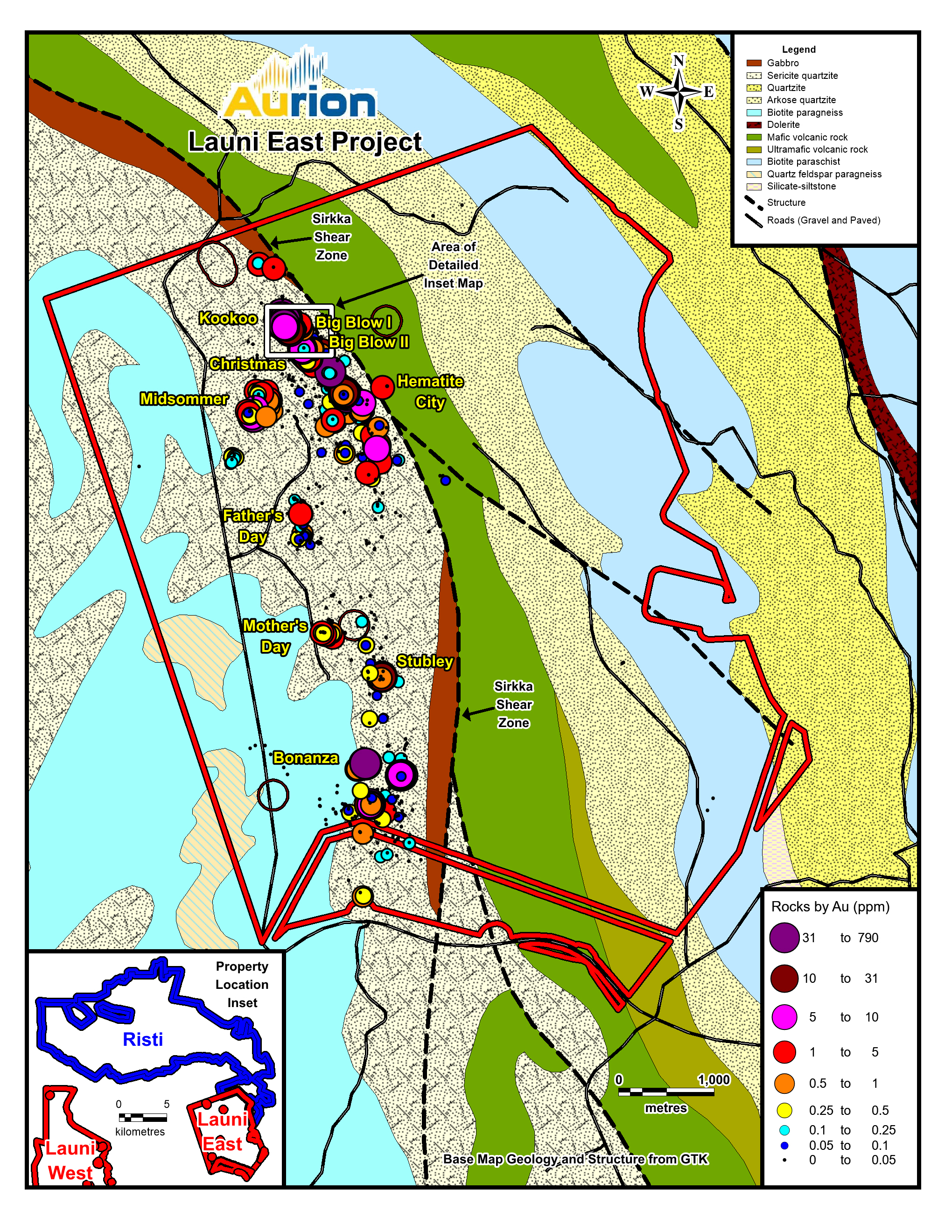 The Launi East property is immediately west of a flexure in the Sirkka Shear Zone, which the GTK (Geological Survey of Finland) defines as a major (> 125 km long) tectono-stratigraphic boundary between Archean and Proterozoic terranes. The arcuate stratigraphy on the Launi East property includes a folded package of siliceous sandstones and mafic to intermediate volcanic rocks.