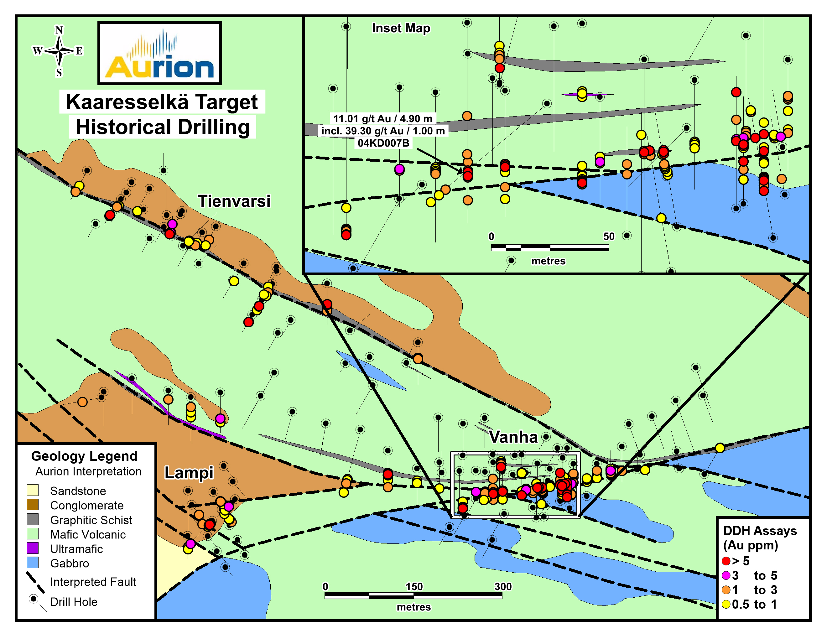 Three individual zones, Vanha, Tienvarsi and Lampi, are found in a 1 km x 0.6 km area. Historical drilling was shallow with gaps along the strike of the zones. Aurion’s additional analysis suggests there is excellent potential along strike and down dip of these gold-bearing structures.