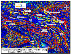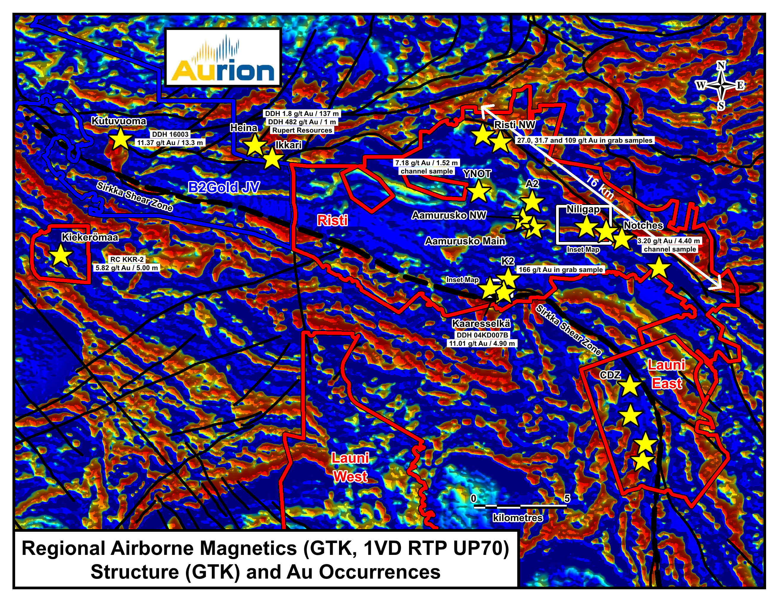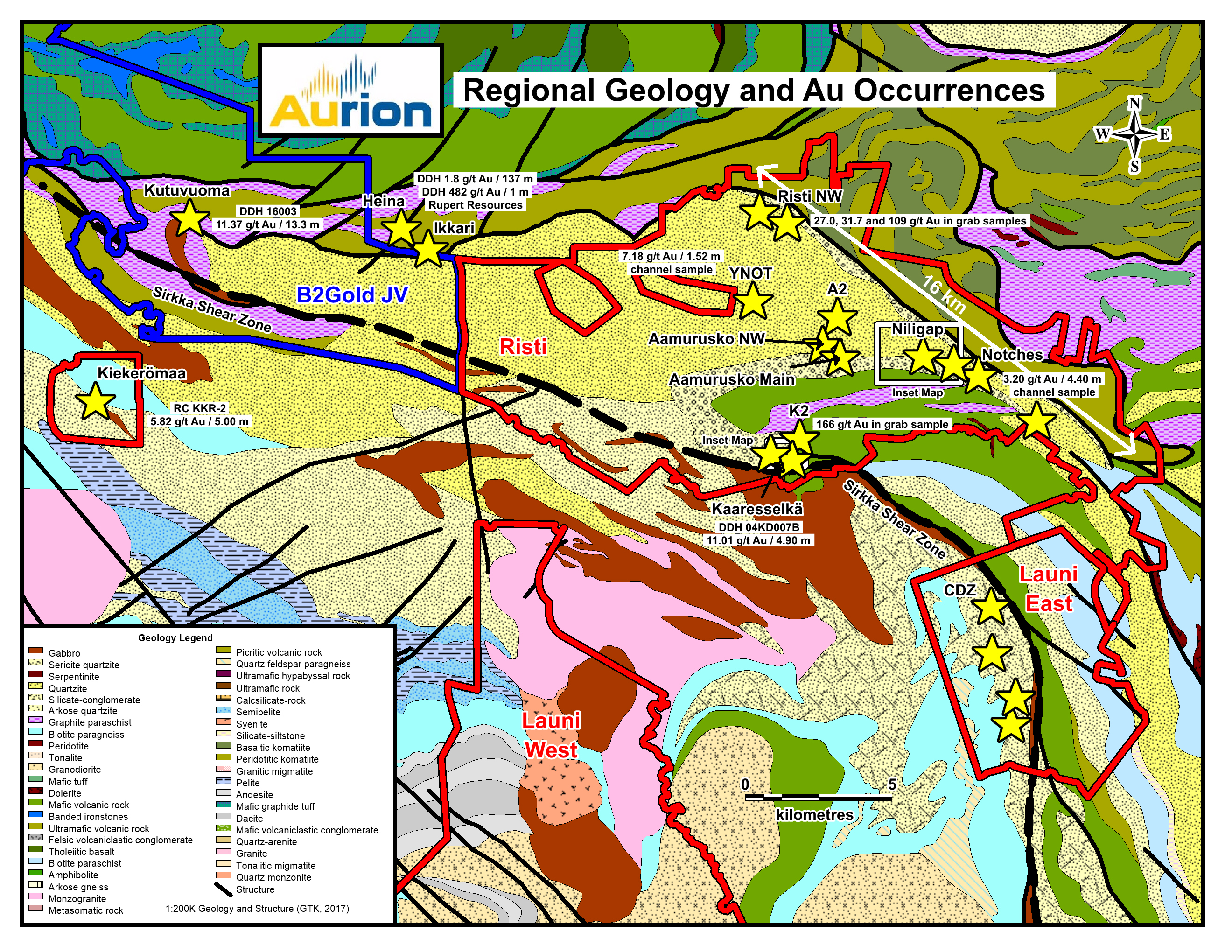 The recent drill results announced by Rupert Resources (TSX-V: RUP), at their new Ikkari and Heina discoveries, immediately adjacent to Aurion’s wholly owned Risti property and the Company’s Kutuvuoma Joint Venture (JV) with B2 Gold Corp. occur in a similar geological setting that occurs on both of those properties, near the contact between the young clastic sediments of the Kumpu group and older volcanics and sediments of the Savukoski Group. These discoveries were drilled approximately 200 m north of Aurion’s Kutuvuoma JV property boundary and appear to extend to the west onto the JV property. B2 Gold Corp. is the operator of the JV and is currently drilling on the JV properties, including Kutuvuoma.