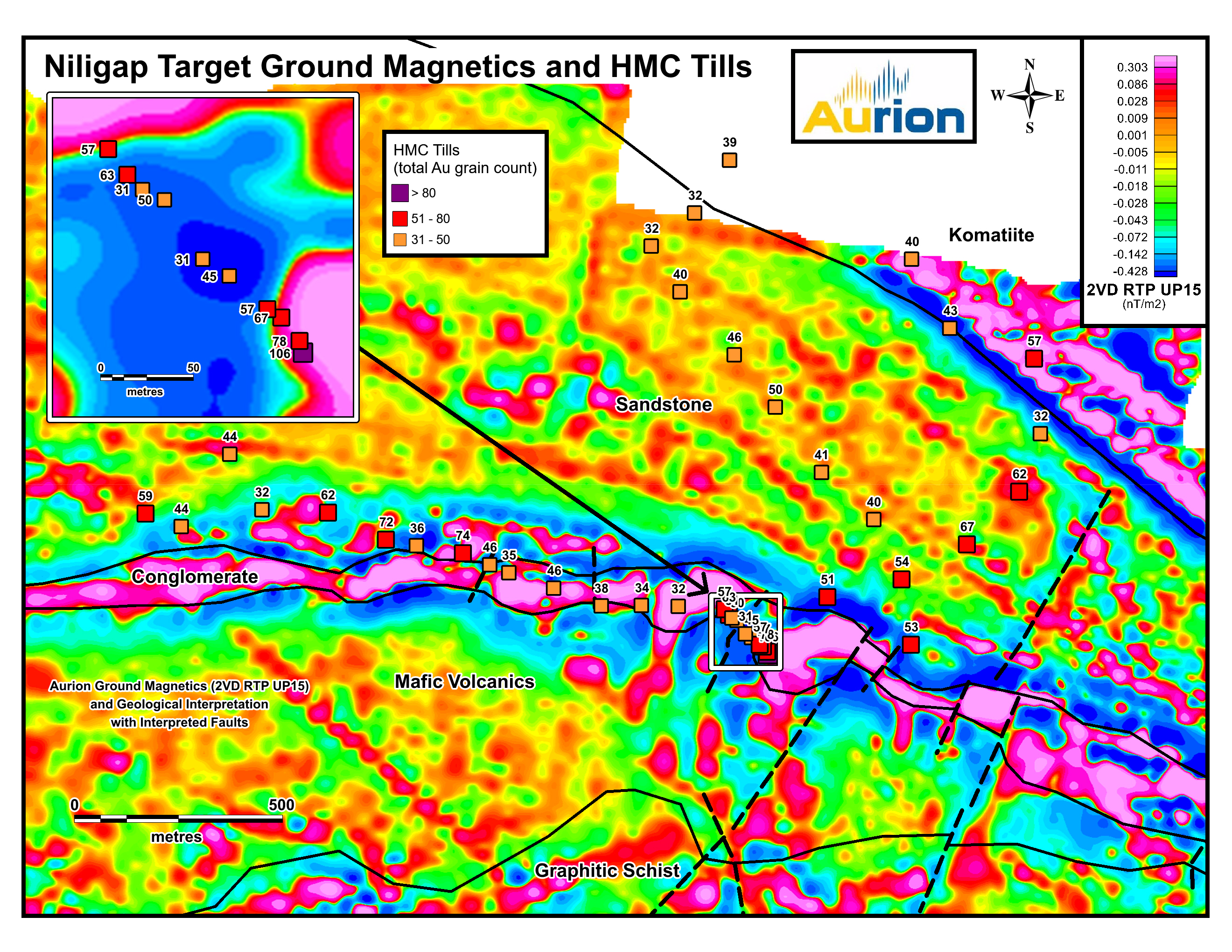 In 2019, Aurion completed a BoT and HMC sampling program using an excavator to dig test pits on 10-200 m spacings. Forty-one (41) samples were collected primarily to test a 2.5 km section of an east-west trending magnetic high between Aamurusko Main and Notches as well as provide information on the glacial drift stratigraphy. The highest gold counts were along the magnetic high, which may represent a volcanic conglomerate unit, proximal to the unconformable contact between the older Sodankylä Group volcanics and the younger Kumpu Group sedimentary rocks. Indicator mineral sample size was 5 litres (about 10 kg) and samples were preconcentrated with a Knelson Concentrator and panned for microscope grain counting. The recovered gold grains, which are up to 0.6 mm in size, are mostly pristine, indicating short transport distances. Grain counts were from 31 to 106 grains, which are all above the 95th percentile (27 grains) of historic regional heavy mineral sampling by Outokumpu (former state mining company) in the Central Lapland Greenstone Belt. These results highlight the gold anomalous nature of the Niligap zone and provide additional evidence of a potential gold bearing structure present between Aamurusko and Notches.