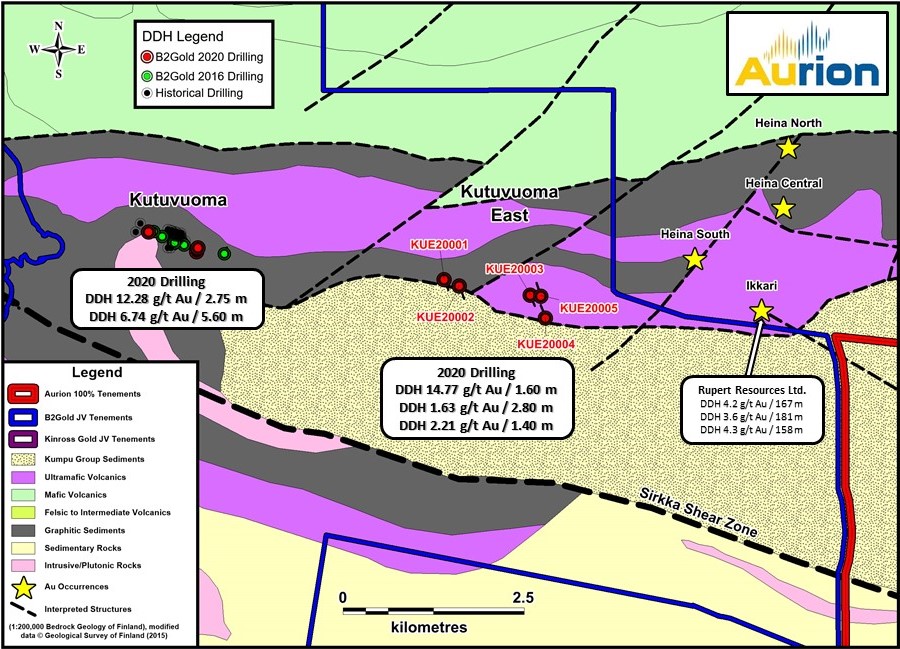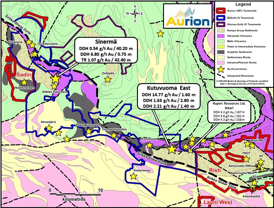 Aurion Resources Ltd. (TSX VENTURE: AU) (OTCQX: AIRRF) (“Aurion” or the “Company”) announces results from exploration activities completed by its Joint Venture (JV) partner, B2Gold Corp. (TSX: BTO) (“B2Gold”) on the Kutuvuoma East and Sinermä areas in the Central Lapland Greenstone Belt in northern Finland.