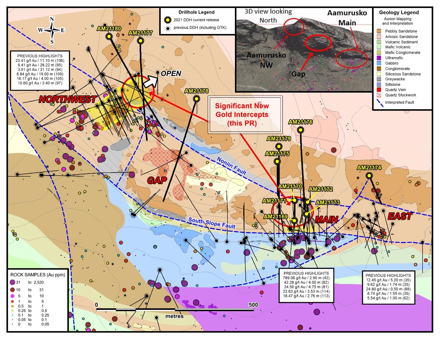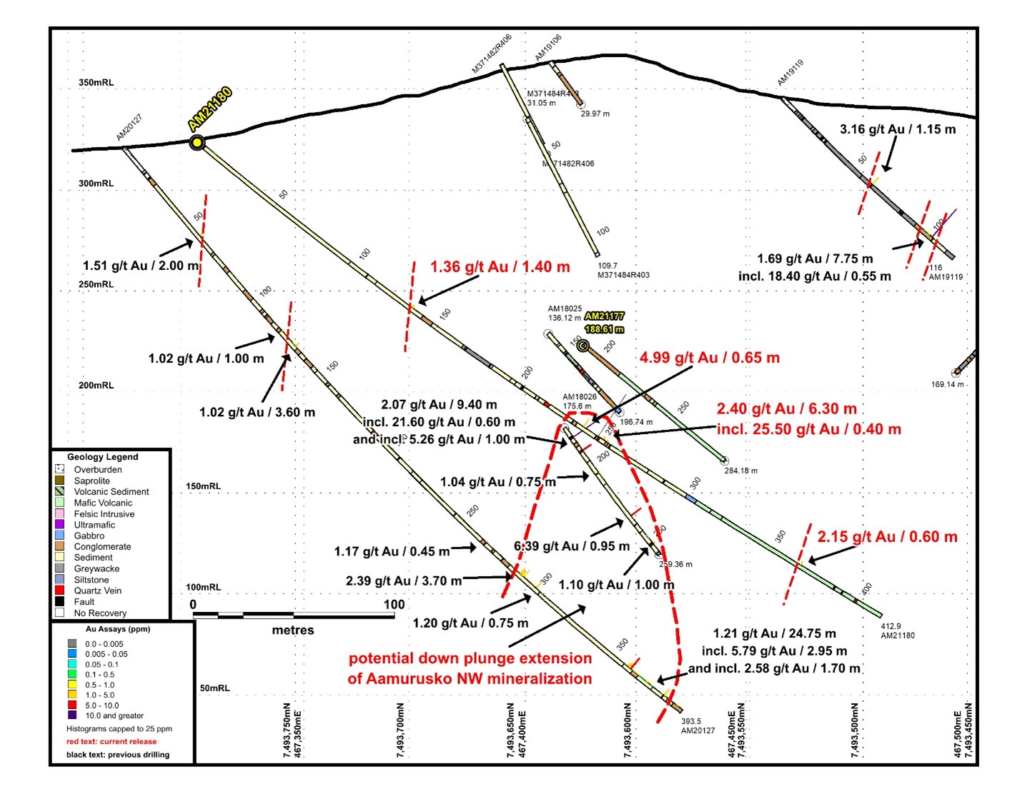 - 3.75 g/t Au over 1.85 m from 111.40 m and 1.83 g/t Au over 2.40 m from 98.80 m (AM21177) in conglomerate approximately 200 m northeast of Aamurusko NW.
