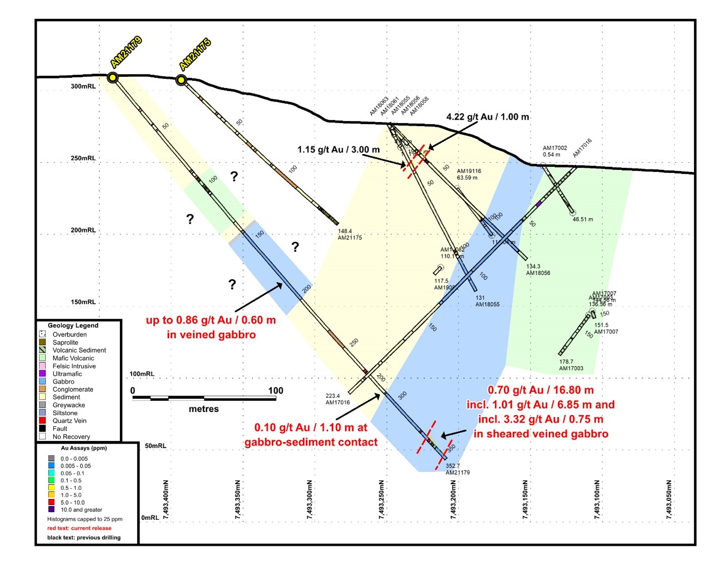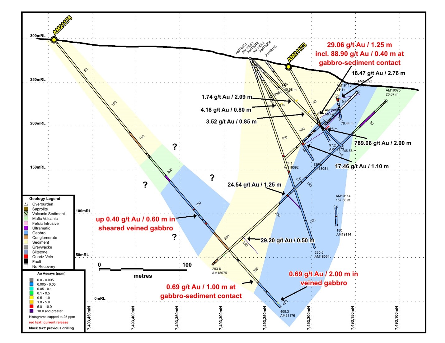 All holes intersected the targeted sheared contact between gabbro and clastic sediments at expected locations. All holes also intersected significant zones of quartz veining with gold values exceeding 1.0 g/t (Figures 2 & 3). Visible gold grains were observed in three (AM21171, AM21172 and AM21173) of the five holes.