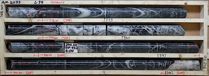 AM21180 also intersected a zone of highly sheared mafic volcanics containing abundant quartz-carbonate veining with elevated gold up to 2.15 g/t Au over 0.60 m from 365.20 m.