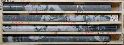 - 2.40 g/t Au over 6.30 m from 246.40 m (AM21180), including 25.50 g/t Au over 0.40 m, 125 m above the previous intercept of 1.21 g/t Au over 24.75 m (AM20127).