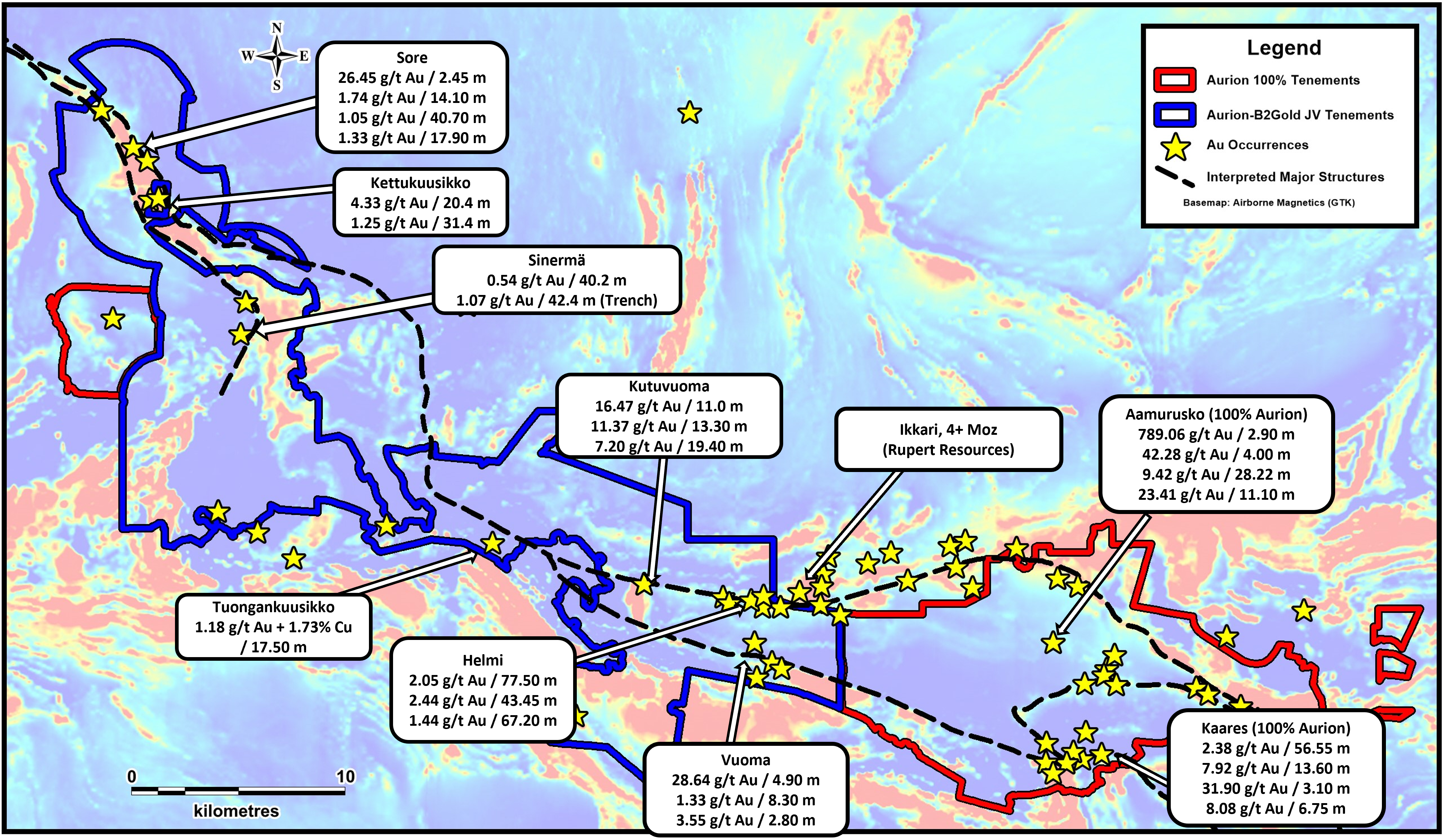 The JV (30% Aurion/70% B2Gold) covers approximately 293 km2 along the major crustal scale Sirkka Shear Zone in the Central Lapland Greenstone Belt and includes a number of discoveries such as Helmi (2.05 g/t Au over 77.50 m), Kutuvuoma (16.47 g/t Au over 11.0 m), Vuoma (28.64 g/t Au over 4.90 m), Soretiavuoma (48 g/t Au over 1.1 m), Sinermä (0.54 g/t Au over 40.2 m), Kiekerömaa (5.8 g/t Au over 5.0 m) and Kettukuusikko (4.33 g/t Au over 20.4 m).
